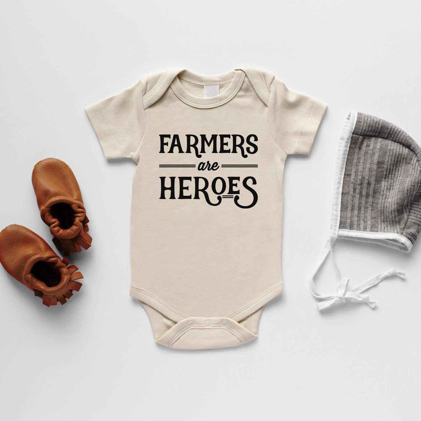"Farmers Are Heroes". Where would we be without them? This super-soft, 100% organic cotton outfit features modern typography in crisp black ink on a luxe cream colored bodysuit.