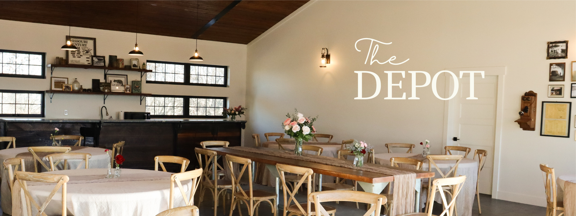 The Depot at Cassidy Station is a charming and versatile space for your wedding day! This space is an add on to our wedding packages. It’s ideal for a bar and cocktail hour as it offers a welcoming atmosphere where guests can mingle and enjoy refreshments. For an intimate reception, it can accommodate up to 64 guests, providing a cozy yet elegant setting for dining and celebrating.