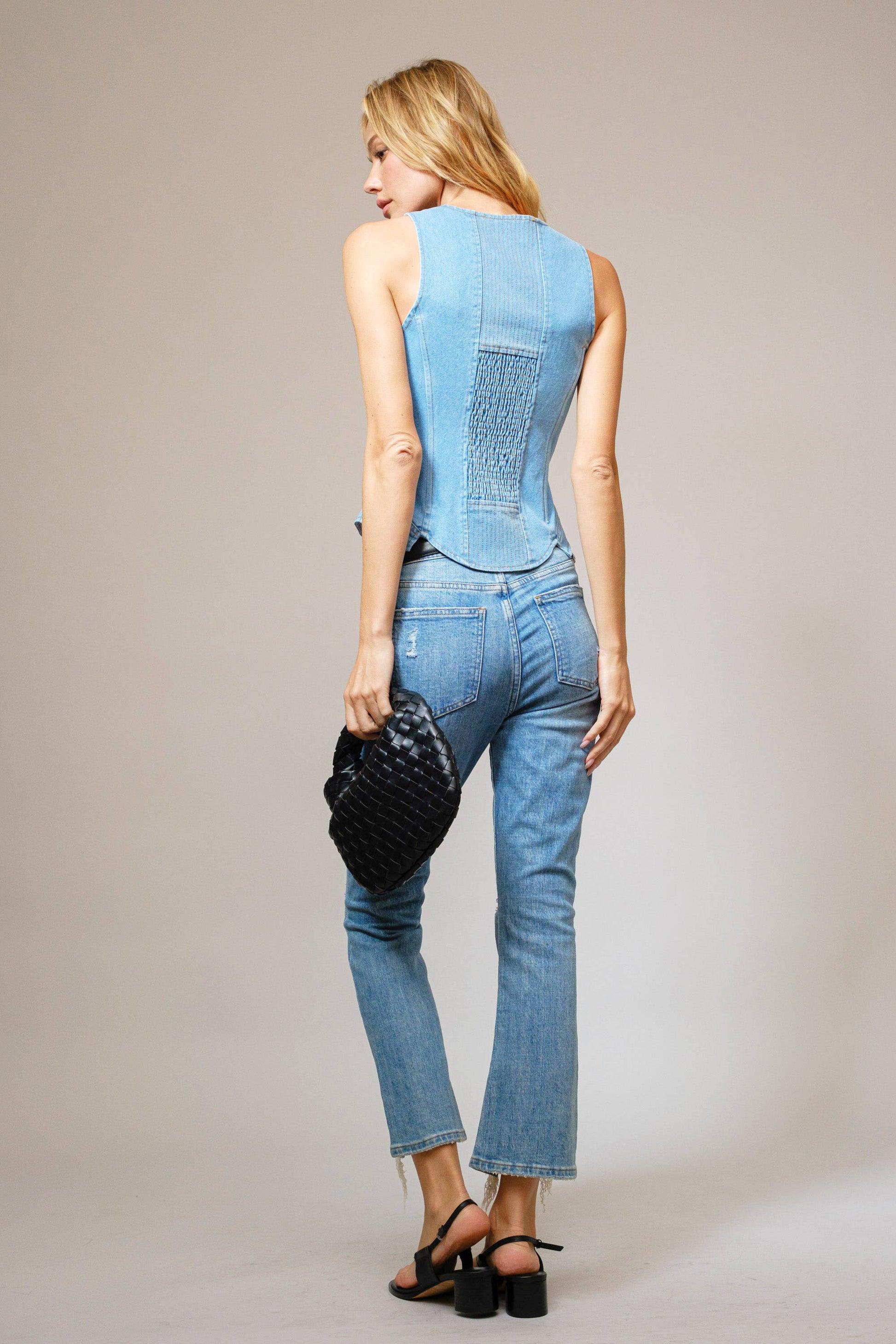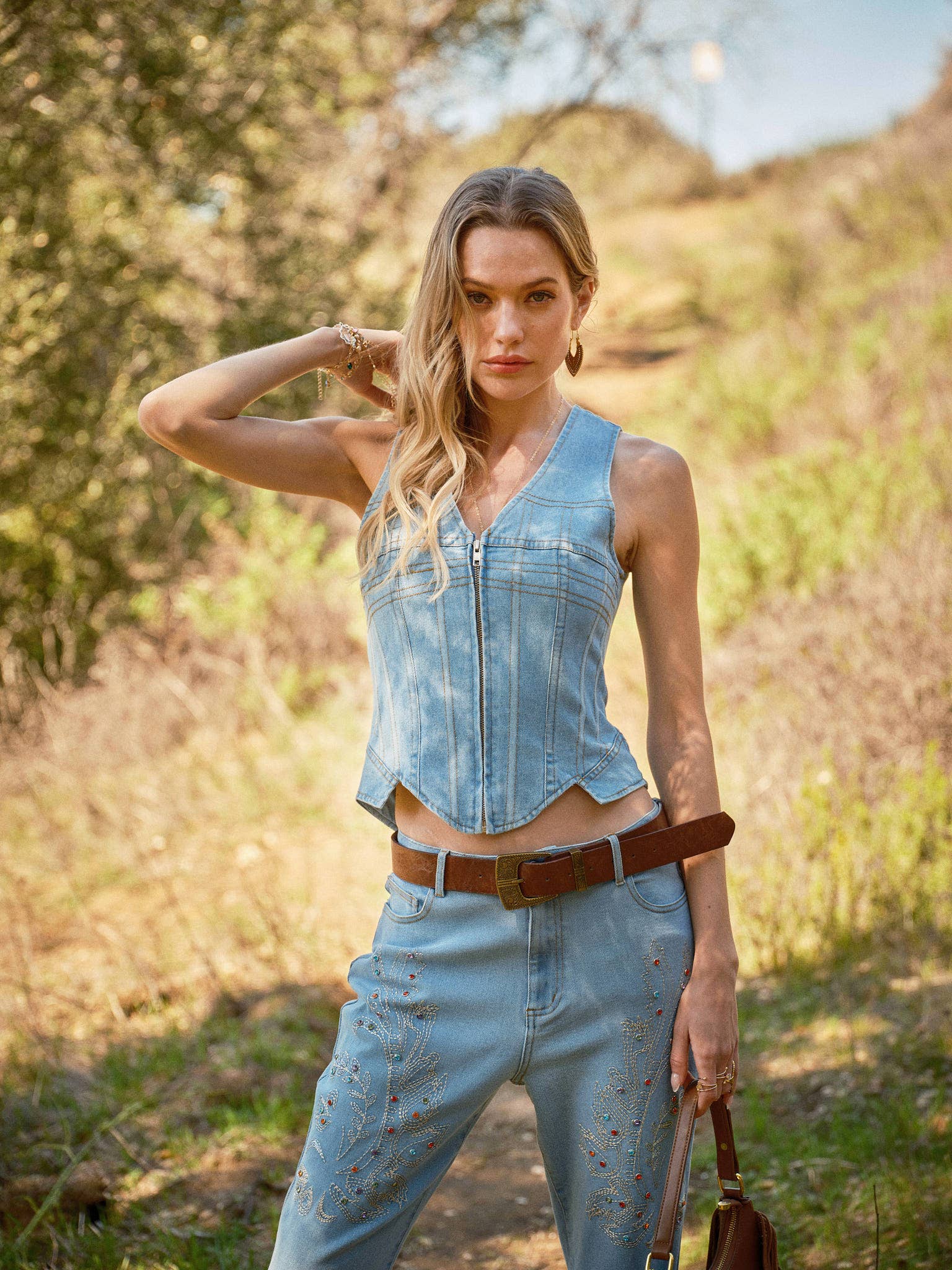 Light wash denim vest designed with a corset-inspired fit and zip-up front. Features structured seams and a cropped silhouette for a modern, edgy look.