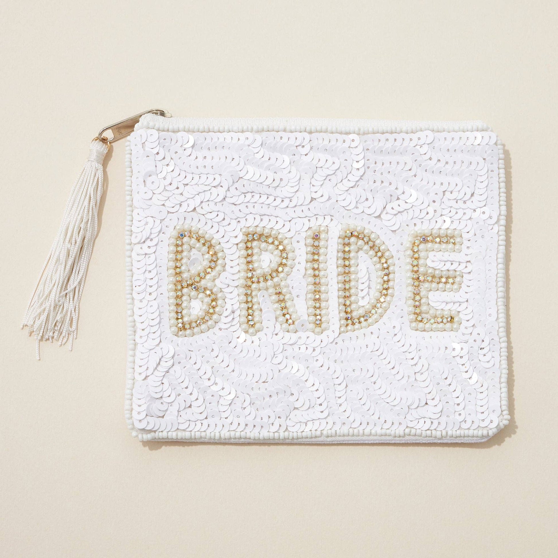 Celebrate your big day in style with this elegant beaded bride clutch, crafted with shimmering white sequins and pearl-accented lettering. The word ‘BRIDE’ is beautifully highlighted in gold and ivory beading, making it the perfect accessory for bridal showers, bachelorette parties, or wedding day essentials. This zippered pouch includes a chic white tassel and offers enough space for makeup, phone, or keepsakes. A stunning gift for any bride-to-be, this bridal clutch adds sparkle and sentiment to every moment leading up to "I do."