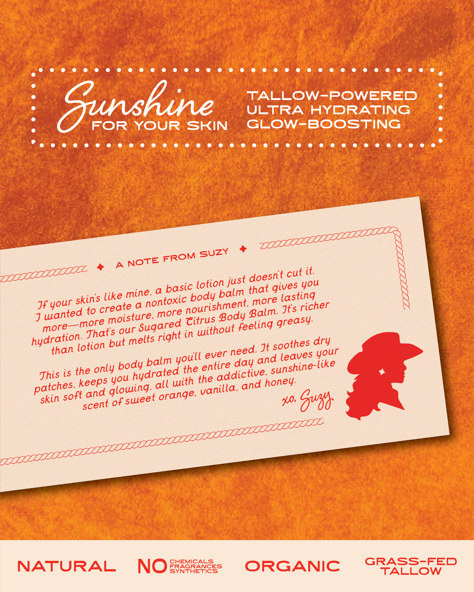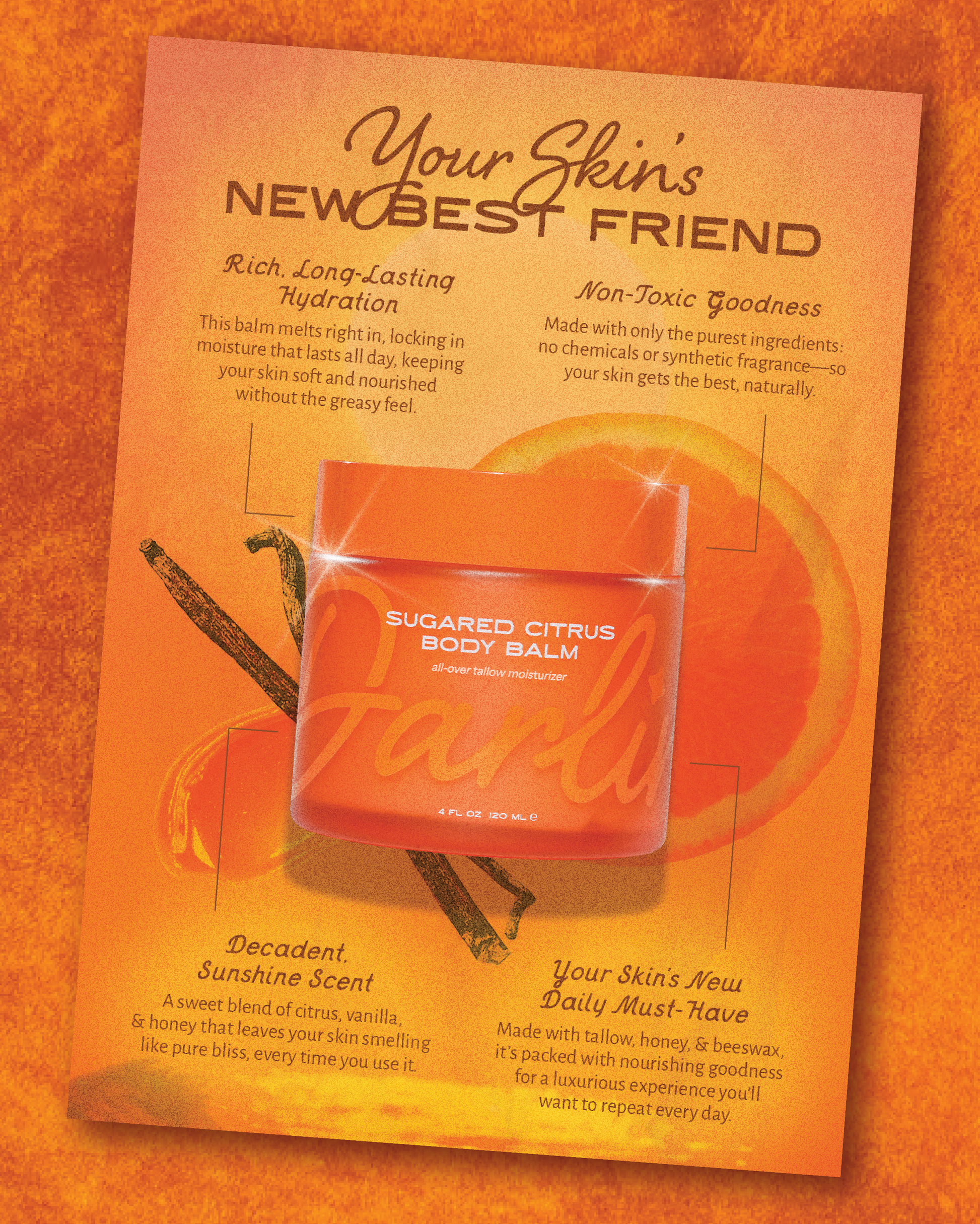 Give your customers a body butter that does it all—deep hydration, long-lasting moisture, and skin-nourishing ingredients like grass-fed beef tallow and raw Sarasota honey. This waterless formula is packed with rich emollients, delivering serious moisture without fillers. And the scent? A dreamy blend of sweet orange, mandarin, and vanilla that feels like sunshine in a jar.