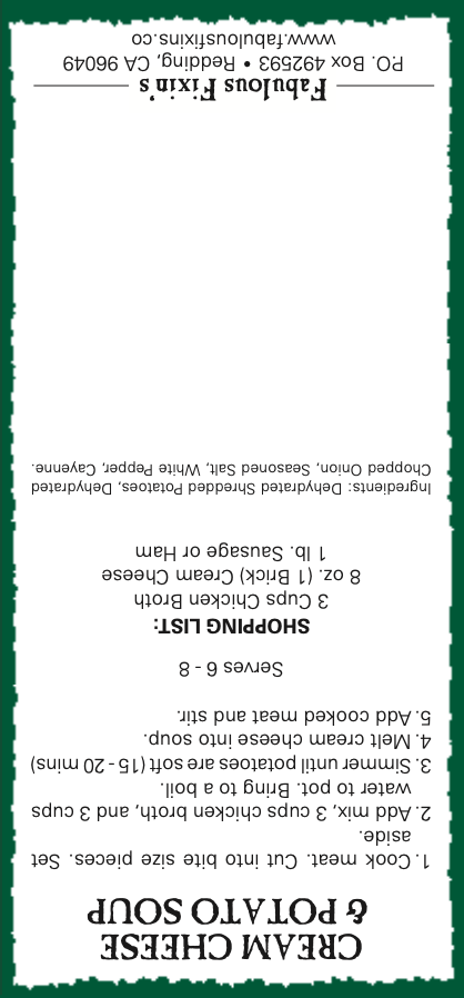A rich, creamy sauce with potatoes that melt into your mouth. A delicious dinner for a cold winter’s night, simply add cream cheese chicken broth, and choice of meat (sausage is our favorite!).