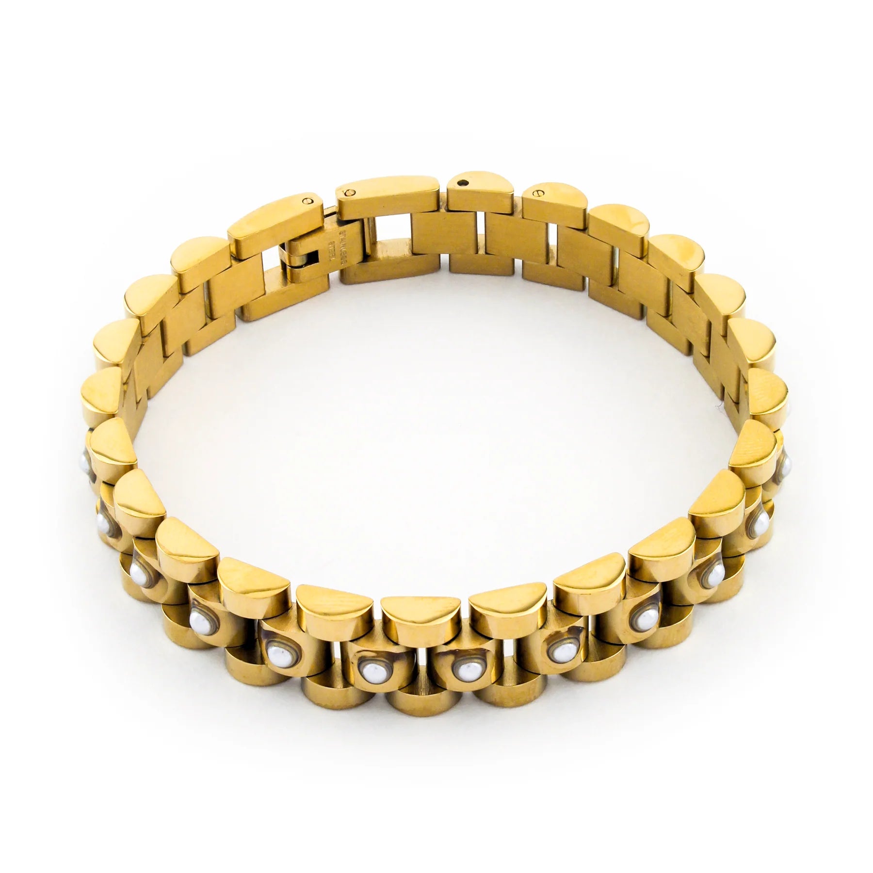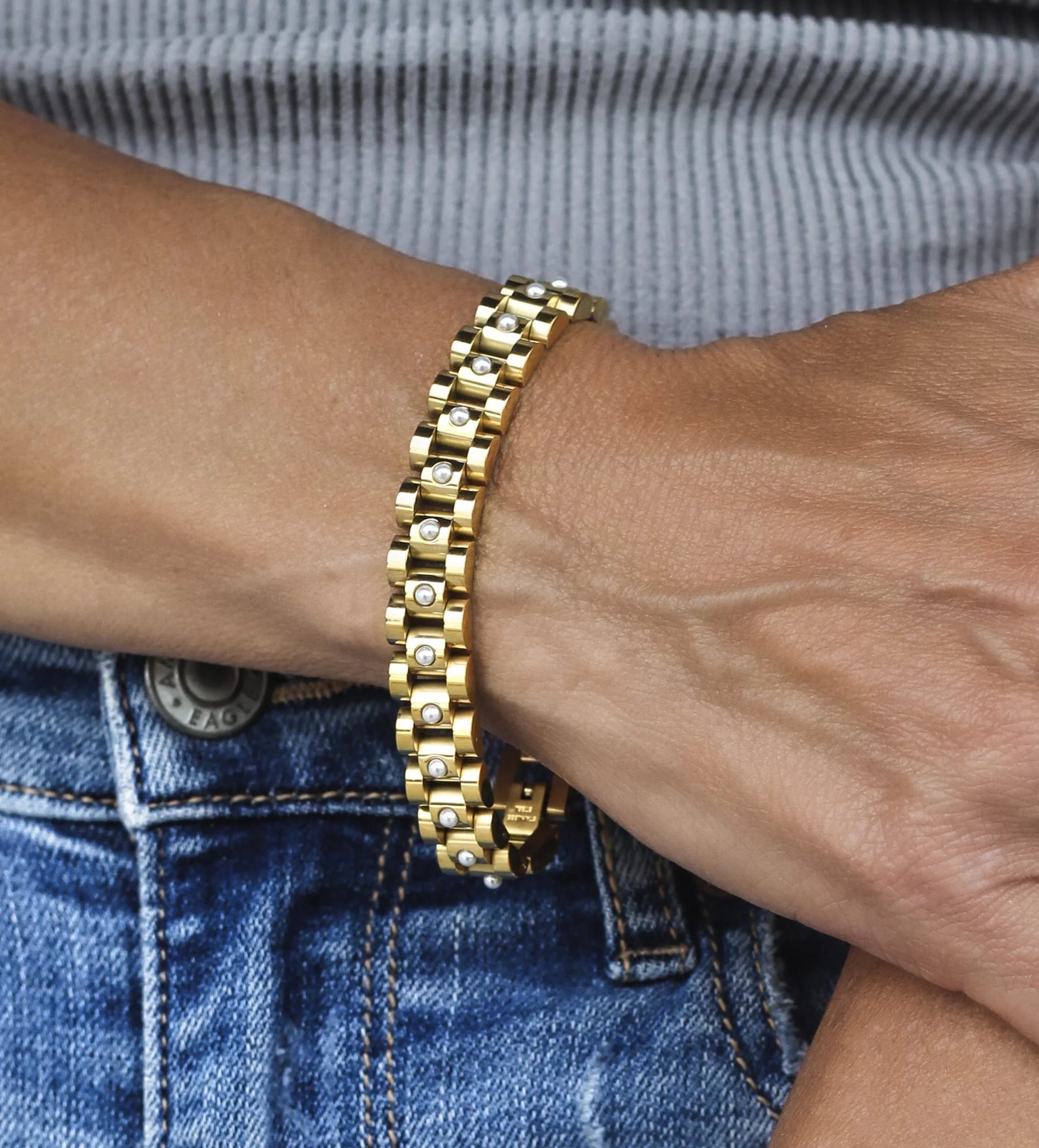 The Quinn Bracelet Pearl is the perfect accessory for any look. The timeless classic design features a gold link bracelet with pearl beads for a luxurious finish. It pairs wonderfully with both formal and casual wear, and its classic tones make it easy to match with any style.