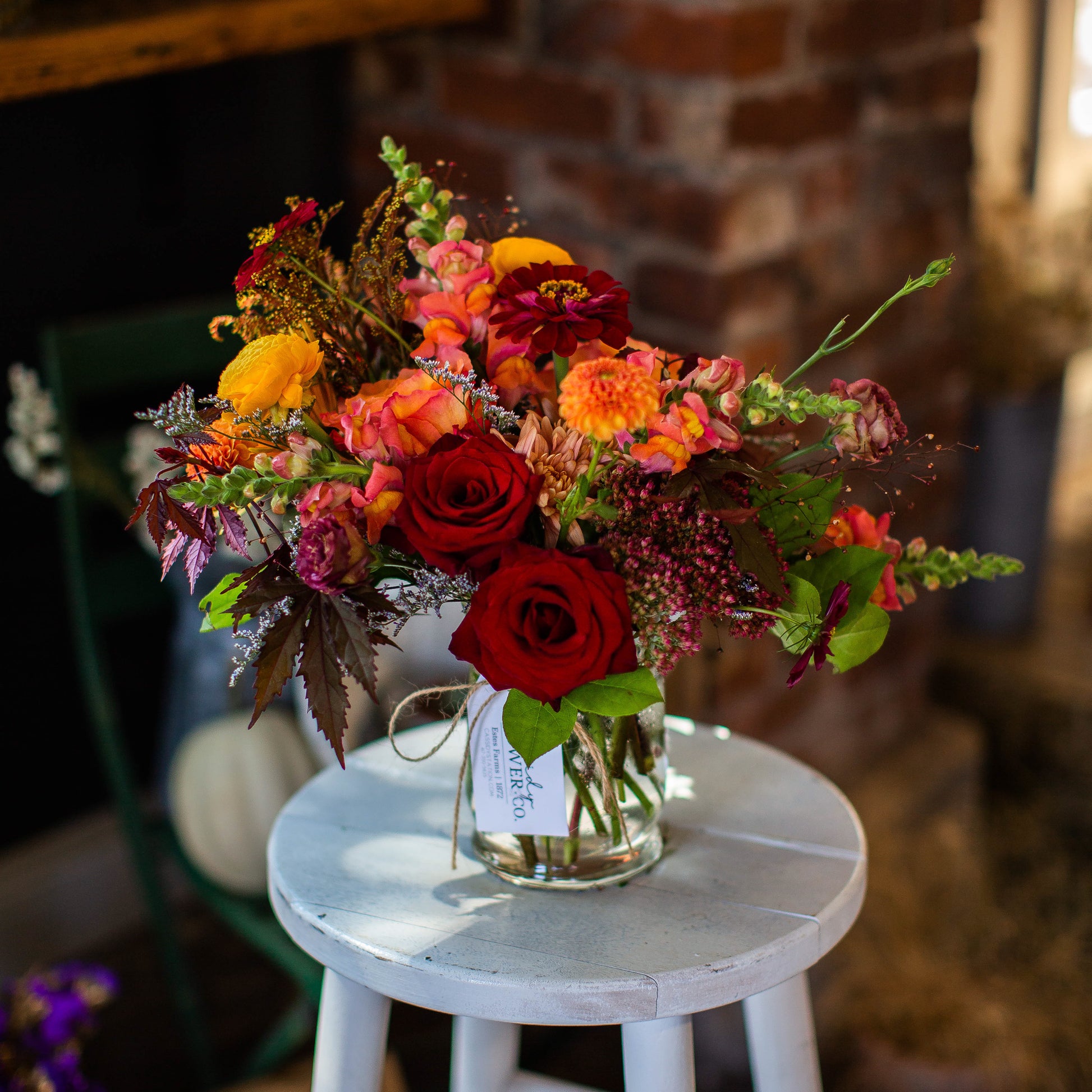 Our "Fall Garden" arrangement features a mix of modern and garden style inspired design. Loaded with lush blooms and texture, this design is perfect for the person who loves something fun, a little less traditional, and still classy. This seasonal arrangement is only available for a limited time, due to the use of our favorite fall colors and flowers!