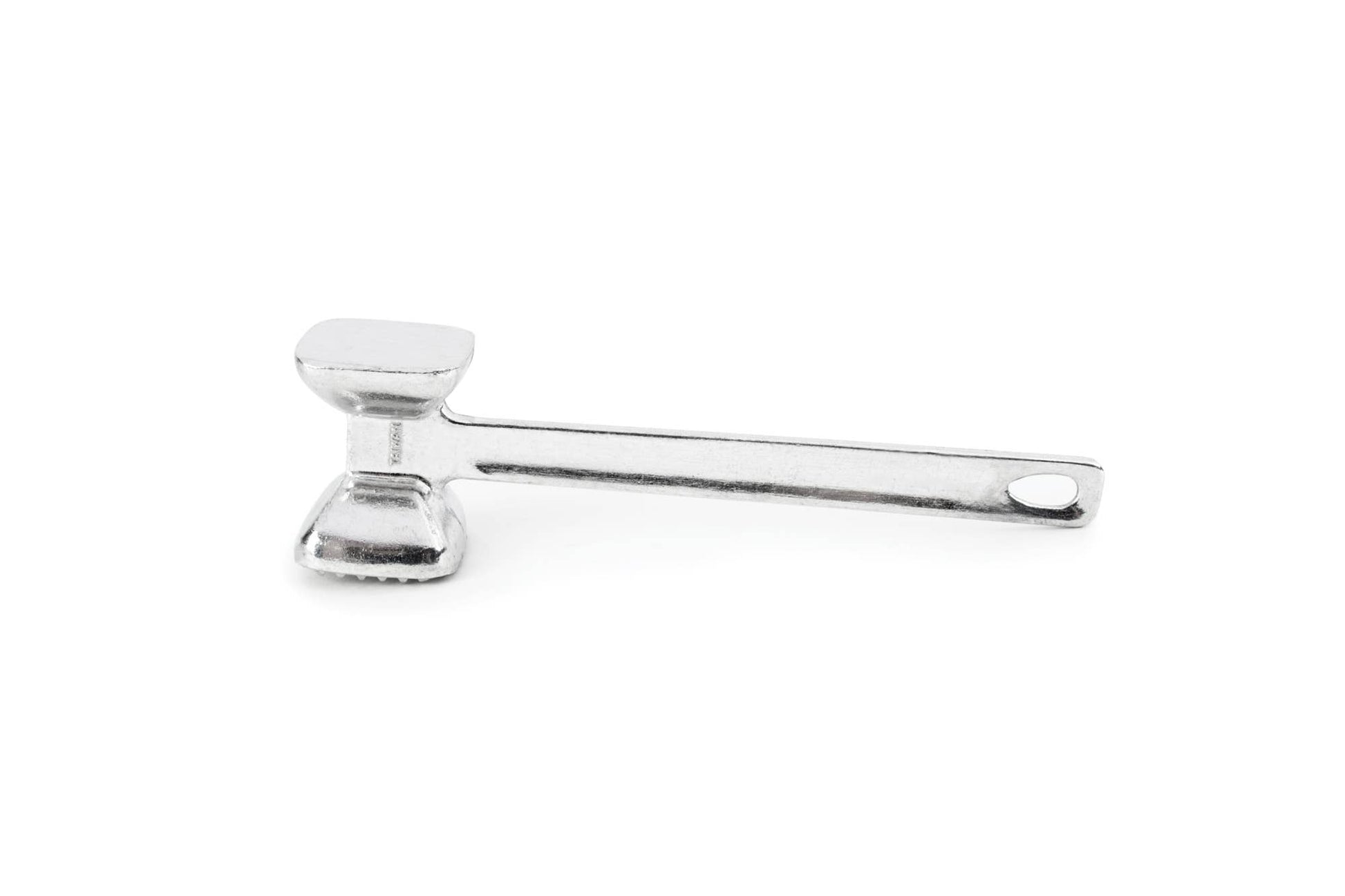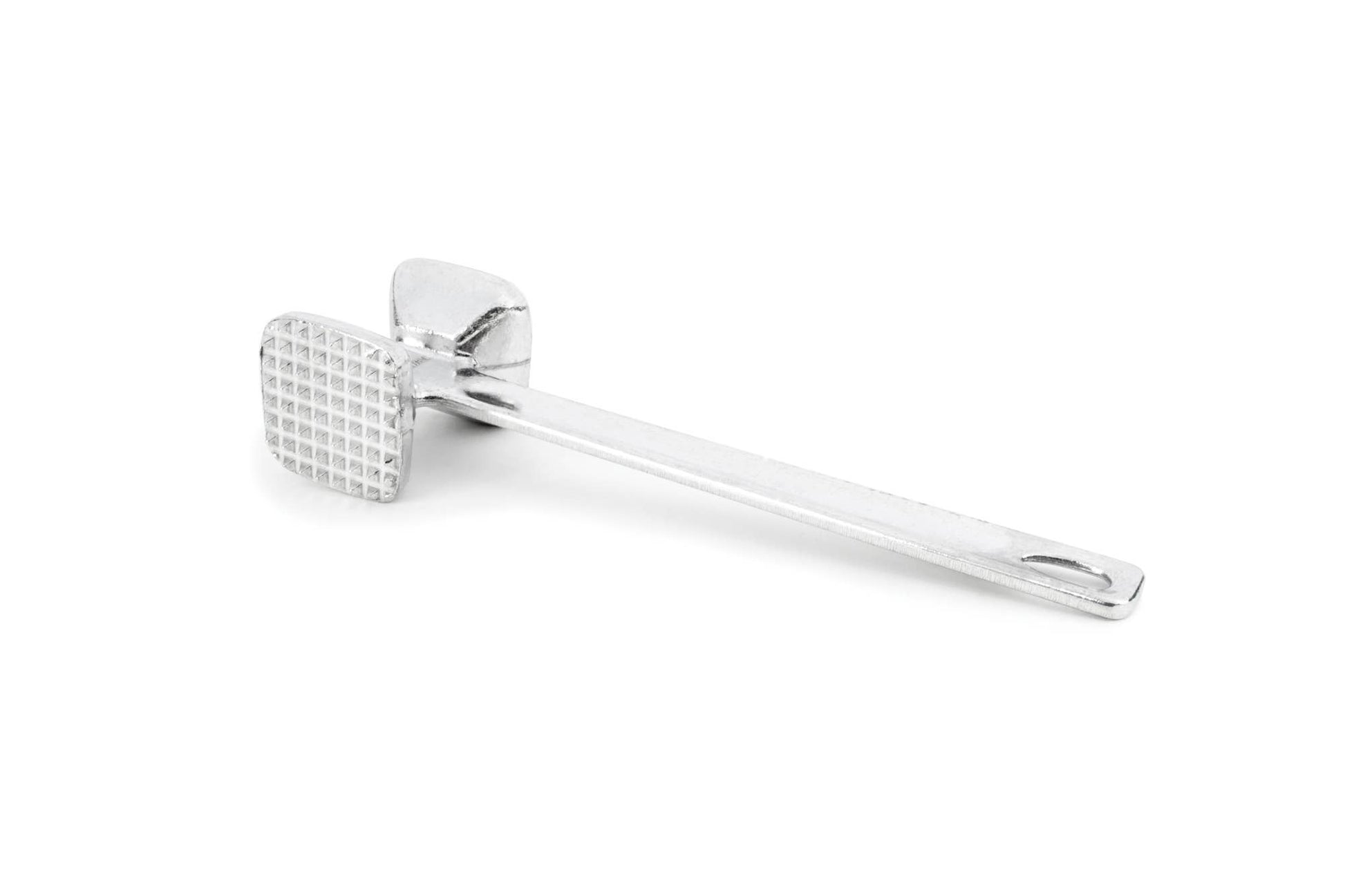 • 2 x 2.5 x 9 inch • Constructed of strong, durable aluminum • Features flat and raised surface for pounding and tenderizing all types and cuts of meat • Weight of 7.5-ounces, easy to use and won't strain your arms • Hand wash only It's hammer time. Tenderize your meats to perfection with this versatile kitchen tool. Constructed of durable aluminum, this meat tenderizer is lightweight, so it's easy to use. It features a smooth surface and raised surface for pounding and tenderizing all types and cuts of meat. This gadget also features a convenient hanging hole for space-saving storage. Once added to your kitchen collection, you'll discover the extensive uses of this item! In addition to tenderizing and flattening chicken, veal, and steak, it can prepare cracked crab, crush nuts and ice cubes, and much more.