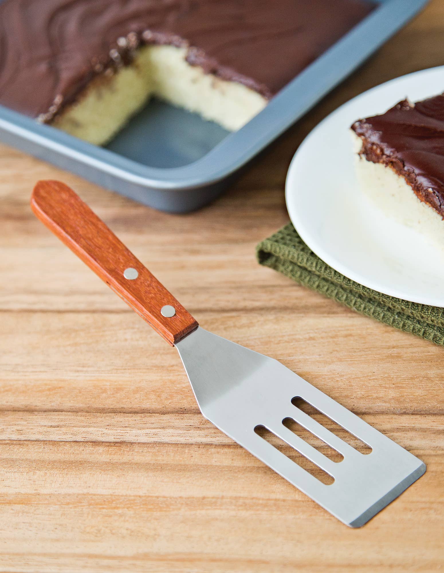 Use the right size for the job. Fox Run's Mini Slotted Turner is perfect for cutting and serving baked desserts, such as brownies, sheet cakes, cookies, and more. Made of quality stainless steel, this kitchen essential features a beautiful hardwood handle. The turner has a full length of 8-inches, with a 4.25-inch metal head. Great for cooking eggs in small cast iron skillets where space is limited!Package Type: Card (not blister)