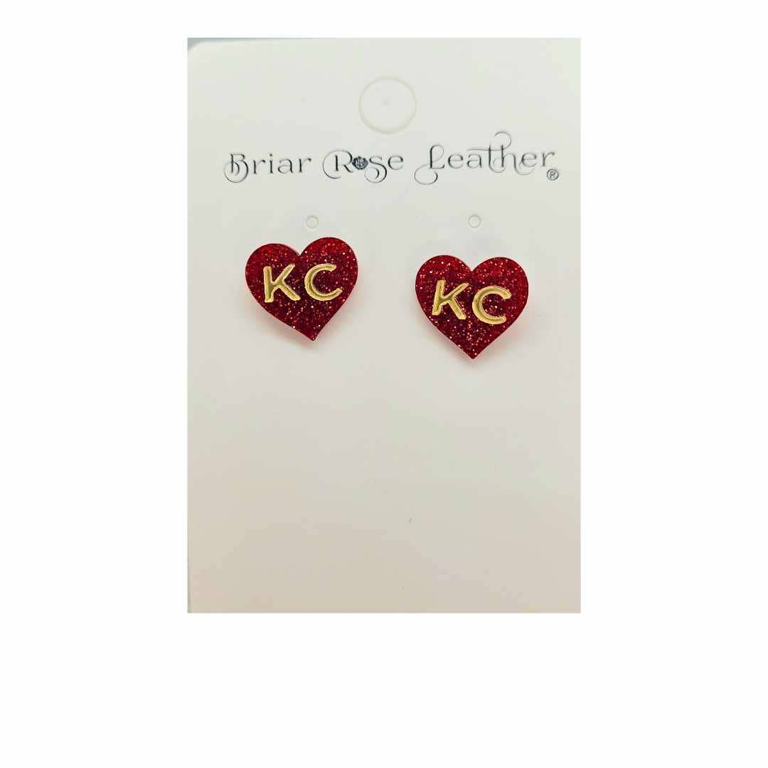 KC Earrings, Chiefs earrings, heart stud earrings, KC football earrings, KC, Acrylic earrings, Red and Gold earrings, stud earrings, Kansas City Chiefs earrings.