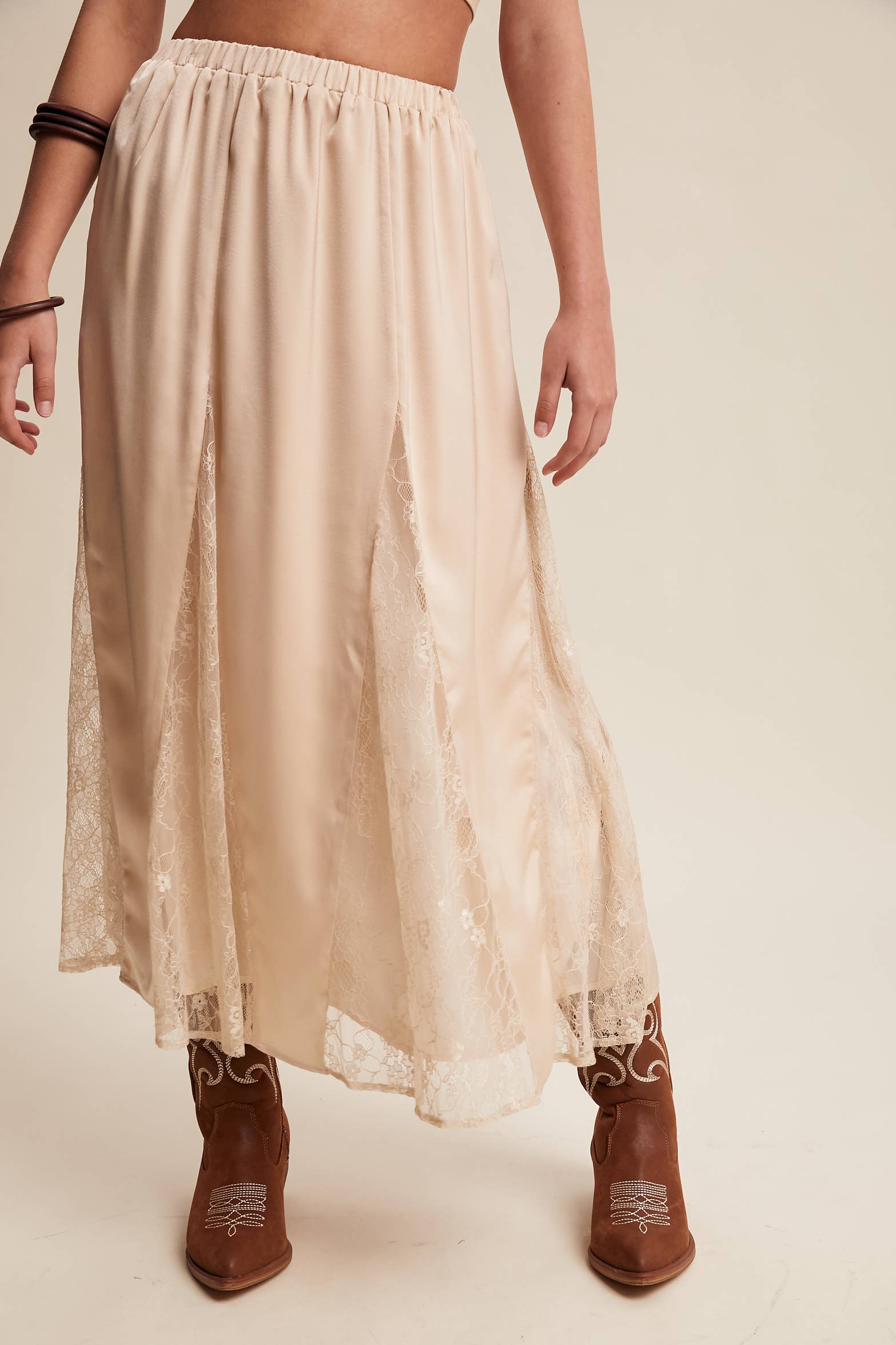 Lace Inset Satin Midi Skirt