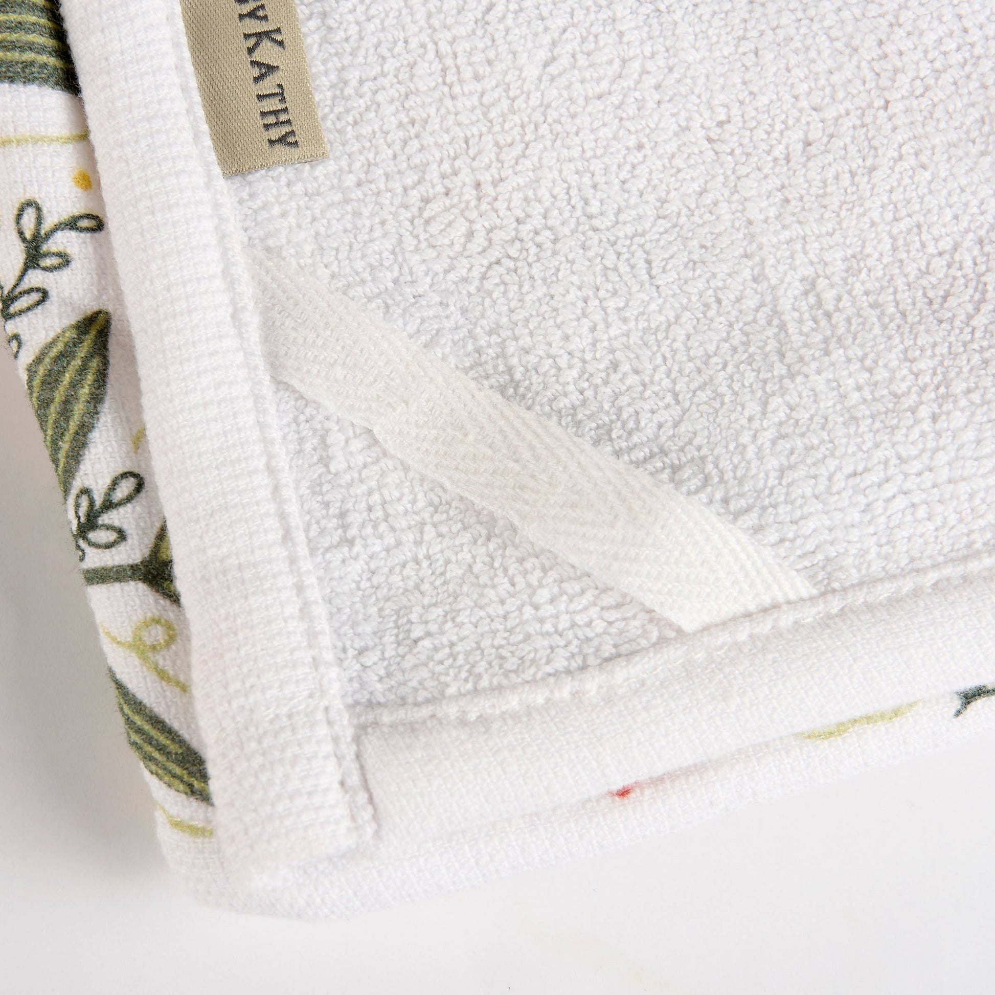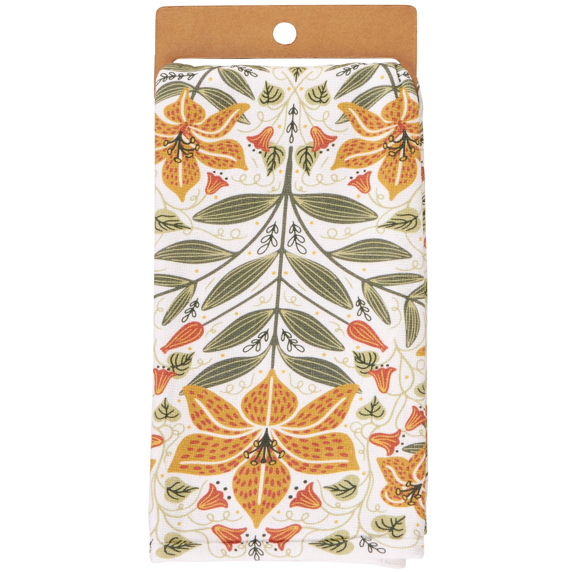 A cotton kitchen towel from our Art Nouveau Collection displaying an all-over design of lilies replicated from original hand illustrated artwork inspired by art nouveau. Floral kitchen towel features a terrycloth layer on the back for added absorbency and corner loop for hanging. Our Nouveau Lily kitchen towel is conveniently machine-washable for easy cleaning. Nouveau towel is packaged on a cardboard hanger with hole to easily display on rack. A vintage floral-themed kitchen accessory perfect for everyday use.