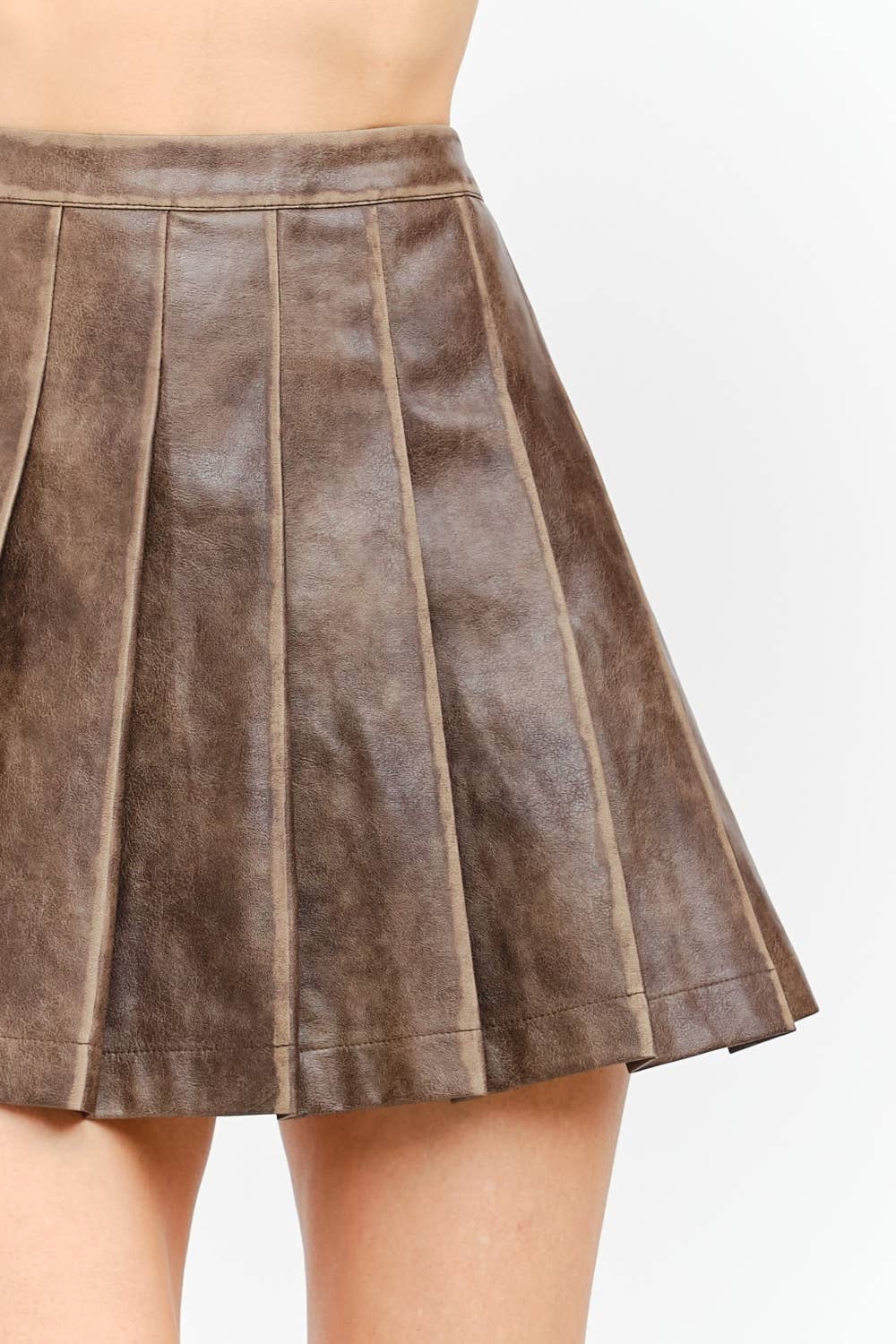 Bold yet feminine, this pleated mini skirt is crafted in a rich, distressed vegan leather finish, giving a classic silhouette an edgy twist. Perfectly flared for movement and style, it’s a versatile piece that pairs just as easily with cozy knits as it does with structured blouses or matching leather separates.